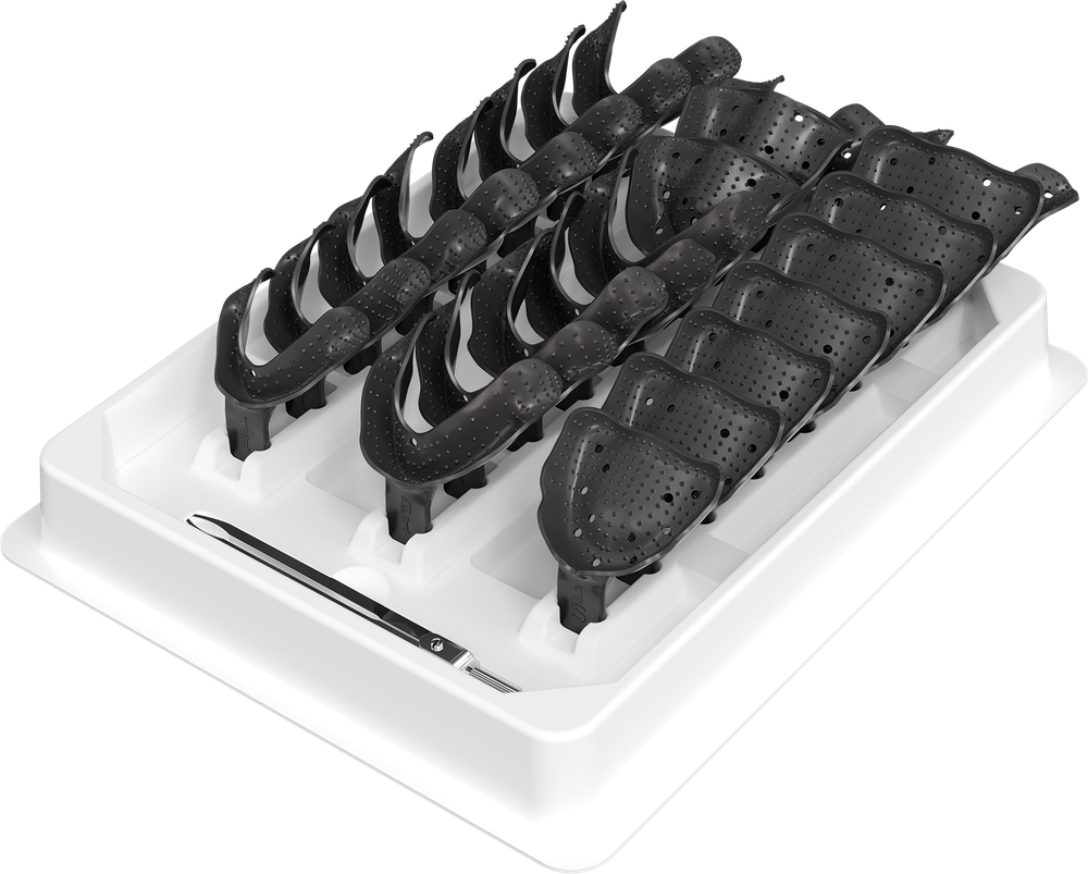 Série de n.º 24 moldeiras + compasso - edêntulos - autoclavável máx 130°C - set de 24 13 inferiores + 7 superiores + 4 mistos